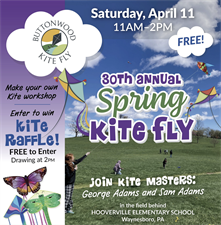 Our 30th annual event. Free kite flying (all ages) with expert flying help from our Kite Masters—brothers Sam and George Adams. Bring your own kite, or make one in the build a kite workshop. All welcome. Free raffle to win a colorful beginners kite! More details at: buttonwoodnaturecenter.org.